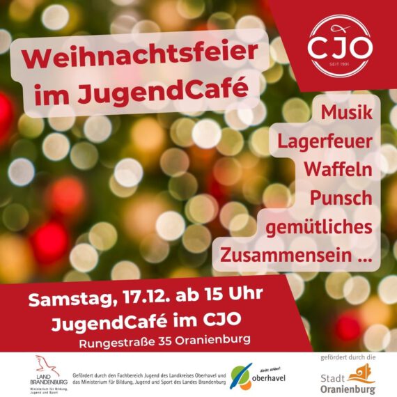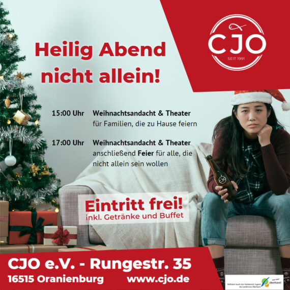 Seit vielen vielen Jahren pflegen wir im CJO eine gute Tradition und öffnen unsere Räume in der Oranienburger Rungestr. 35 am Heiligen Abend für alle, die Weihnachten nicht allein feiern möchten. Wie es sich für einen Heiligen Abend gehört natürlich mit einer Weihnachtsandacht und Theaterstück von den Kindern und Jugendlichen, […]