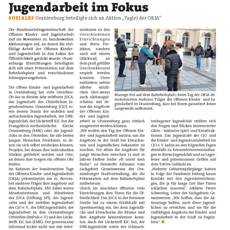 Wir freuen uns, als CJO seit vielen Jahren ein Teil dieses Netzwerks zu sein und die sozialpädagogische Arbeit in Oranienburg mit unseren Arbeitsbereichen JugendCafé, mobile Jugendarbeit, KinderMobil und KidsTreff gestalten zu können.