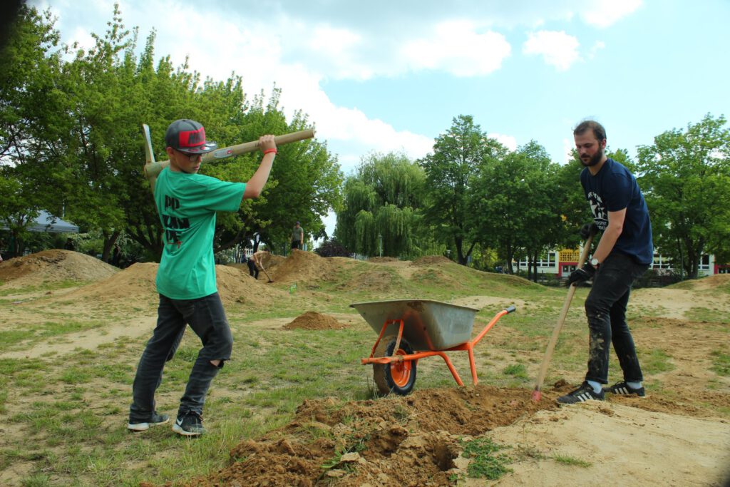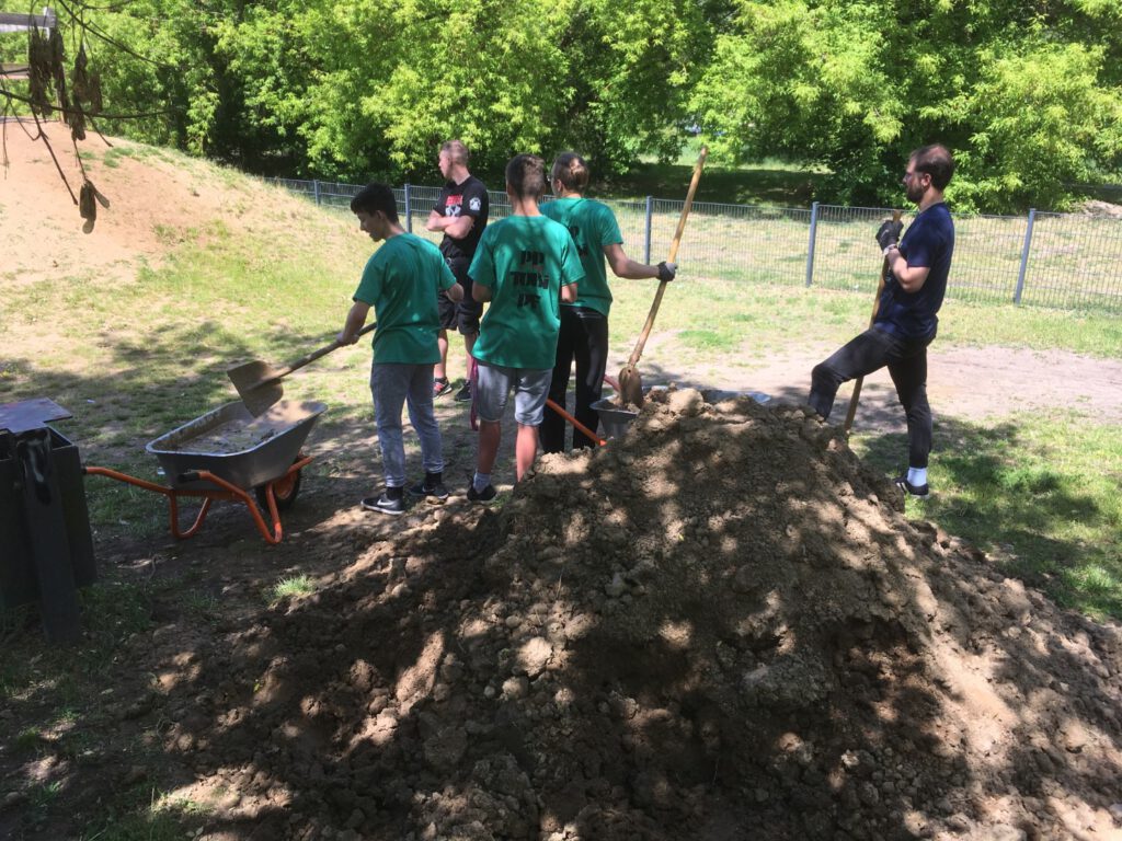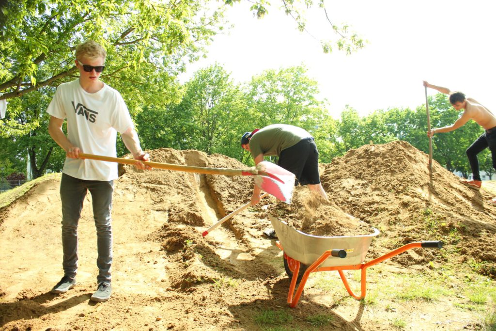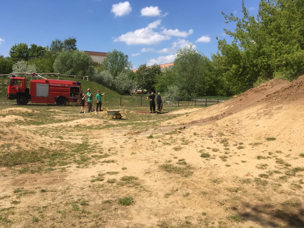 Fast 30 Jungen und Mädchen im Alter von 7-25 Jahren haben mitgemacht und die Lehmhügel mit Schaufeln dun Spitzhacke bearbeitet. Unterstützung bekamen wir von der Feuerwehr, die zu Beginn das Gelände bewässerte und aus hartem Lehmboden wunderbaren Matsch machte. Außerdem kam Stadtbauhof mit einem Radlader, so dass der frisch angelieferte Lehm schneller verteilt werden konnte. Mit so viel Unterstützung und den Jugendlichen aus unterschiedlichen Cliquen und einigen ganz jungen Erwachsenen, die schon etwas Erfahrung beim Bau einer Dirtbike-Strecke hatten kamen wir sehr gut voran.