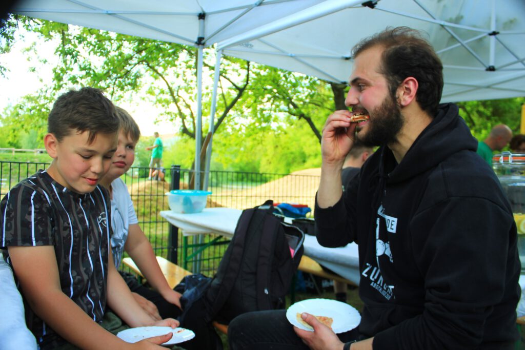 Das JugendCafé des CJO e.V. versorgte alle Teilnehmer mit kühlen Erfrischungsgetränken und schattigen Plätzen für die Erholungspausen zwischendurch. Im Anschluss an die Buddelaktion wurde dann gemeinsam Pizza gebacken, denn der mobile Pizzabackofen musste auch dringend eingeweiht werden. Da waren dann auch viele Eltern und jüngere Geschwister dabei, was dem Projekttag fast schon einen festlichen Charakter verlieh.