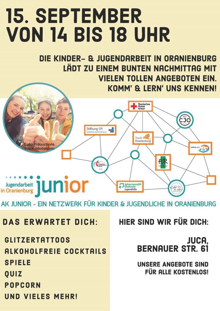 Ein Kooperationsprojekt von: DRK M.O.H.S. e.V., Stiftung SPI, Stadt Oranienburg, Christliches Jugendzentrum Oranienburg e.V., Evangelisch Methodistische Kirche Oranienburg, PUR gGmbH, ImPuls e.V., Evangelisches Johannesstift Jugendhilfe, KidsKreativ e.V. in der Zusammenarbeit im AK junior – ein Netzwerk für Kinder & Jugendliche in Oranienburg