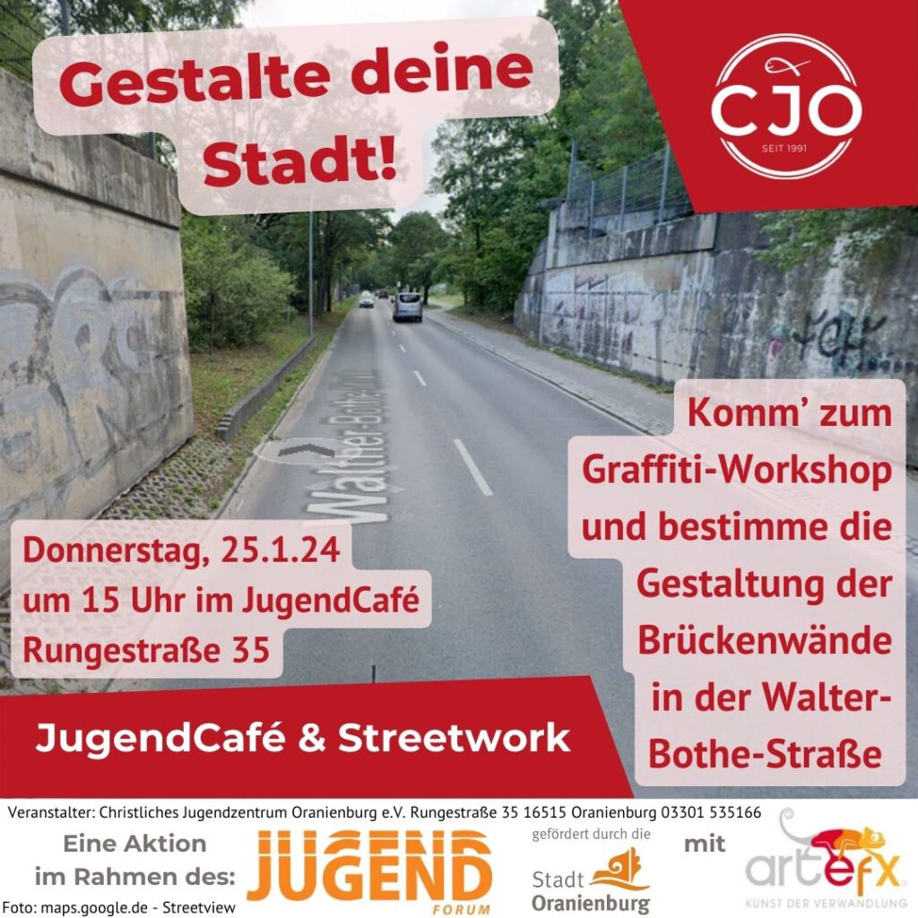 Jung und kreativ? Ganz spontan kannst du bei einer coolen Aktion des Jugendforum der Stadt Oranienburg. Gemeinsam mit einer professionellen Graffiti-Kunst-Firma kannst du bestimmten, wie die derzeit noch super hässlichen Brückenwände an der Walter-Bothe-Straße mit Graffiti gestaltet werden. Sei mit dabei und beeinflusse, wie diese Wände, die ja an einer der Haupteinfahrten nach Oranienburg liegen, später aussehen werden.