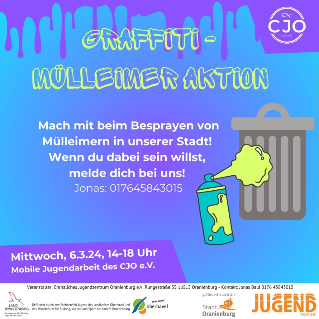 Hast du Lust auf mehr Farbe in der Oranienburger Innenstadt? Dann sei unbedingt dabei, wenn wir Mülleimer mit Graffiti neu gestalten. Dabei geht’s vor allem an die Orte, wo Jugendliche sich eh gern aufhalten. Bring deine kreativen Ideen mit und am Besten Kleidung, die etwas Farbe abbekommen darf.